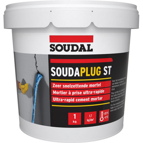 Soudaplug ST is een snel uithardende, cementgebonden mortel voor het direct dichten van actieve waterlekken in beton, metselwerk en steen. Dit poeder wordt eenvoudig gemengd met water en vormt binnen enkele minuten een sterke, waterdichte afdichting, zelfs onder hoge druk.